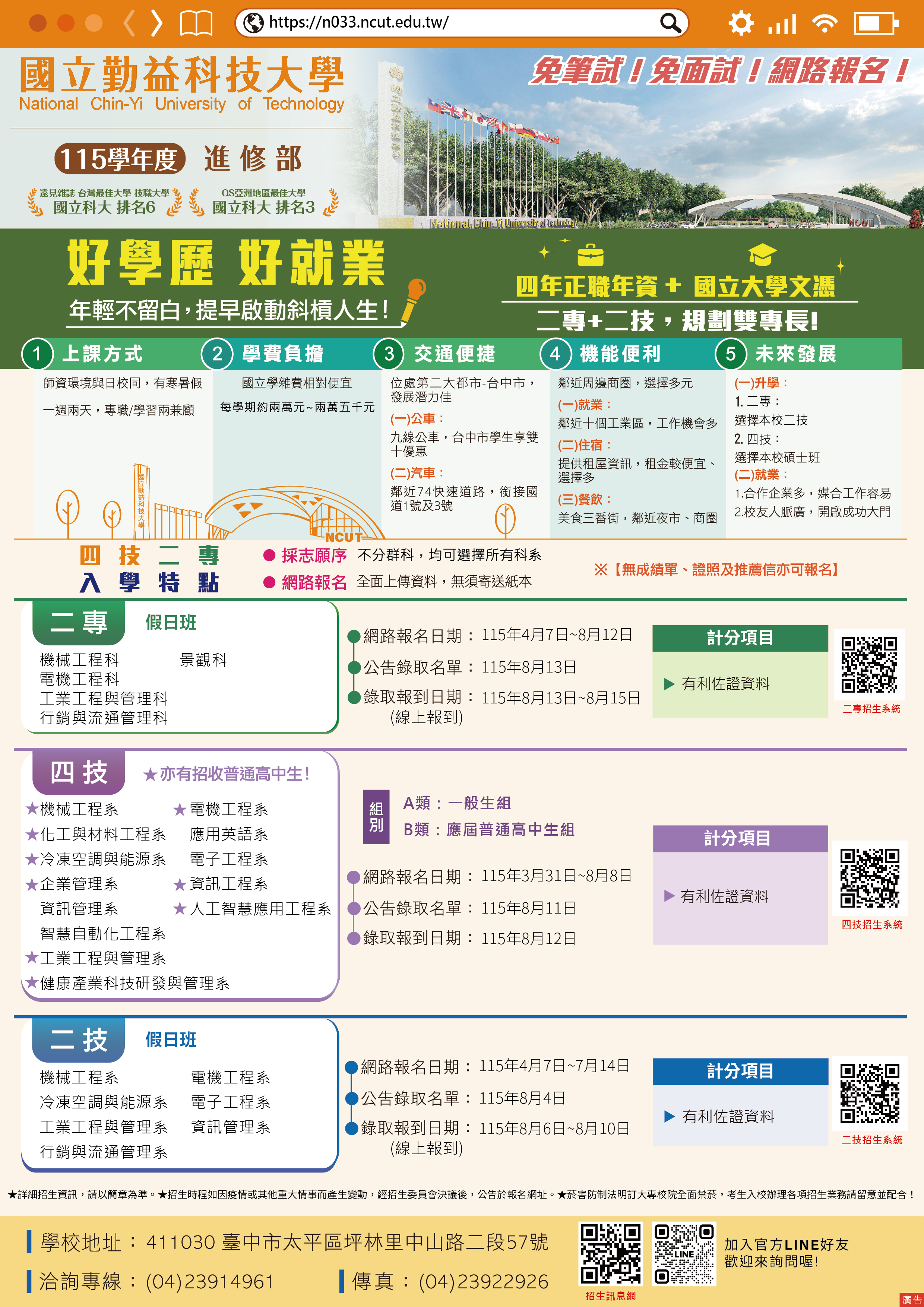 六、相關報名資格及繳交文件,詳請上網查詢該校115學年度二專進修部招生簡章。