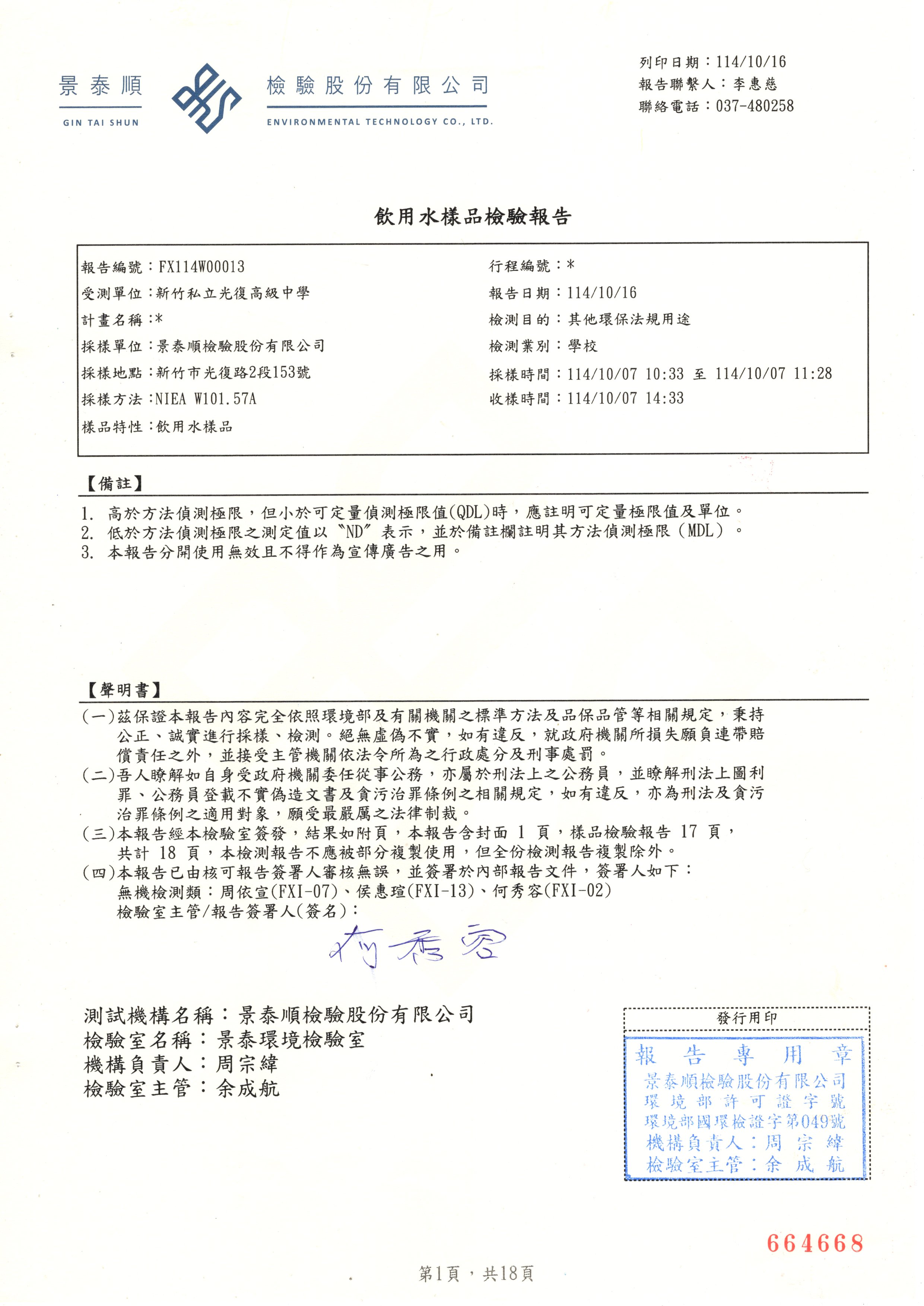 校區飲用水檢驗報告-114.10