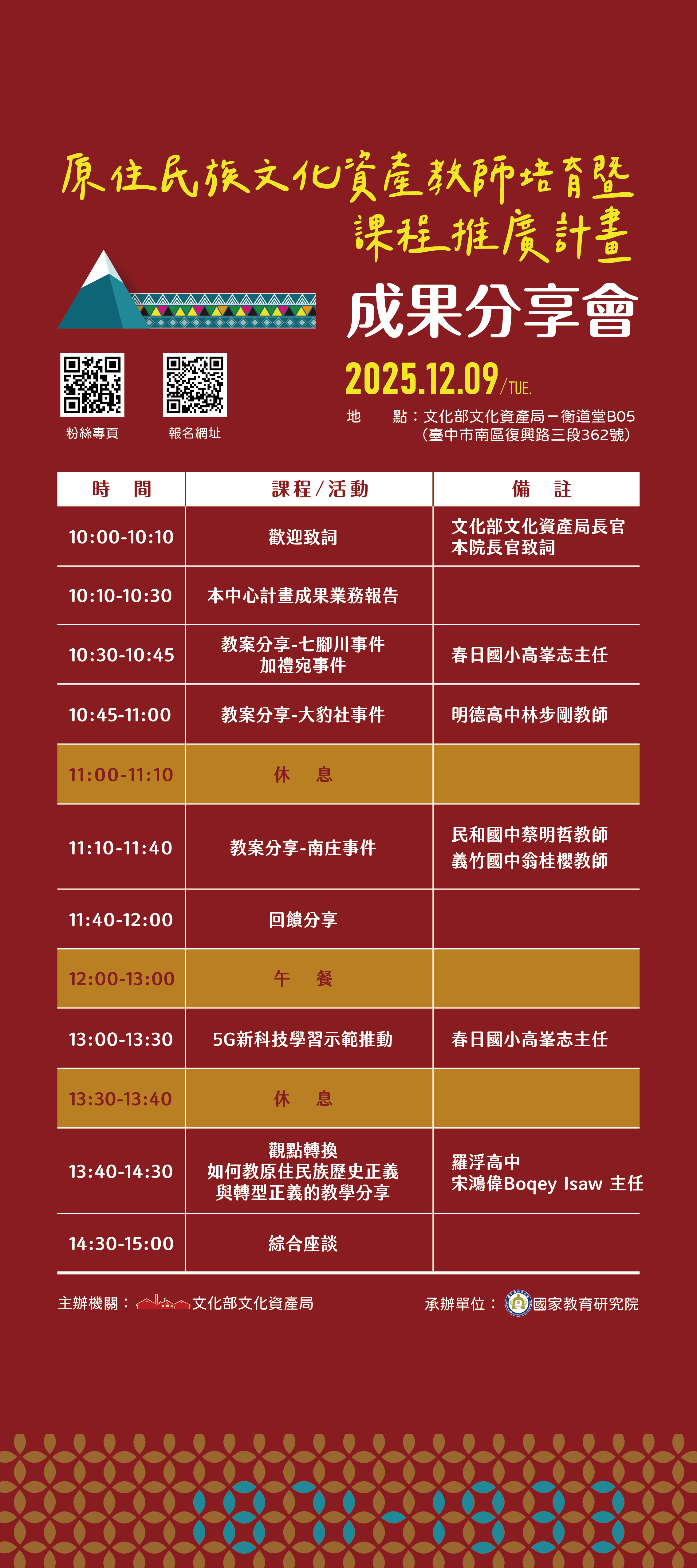 轉知-[教育部國民及學前教育署]函轉國家教育研究院辦理「原住民族文化資產教師培育暨推廣課程計畫」成果分享會,請公告周知並鼓勵所屬教師踴躍報名參加,並惠予公(差)假登記