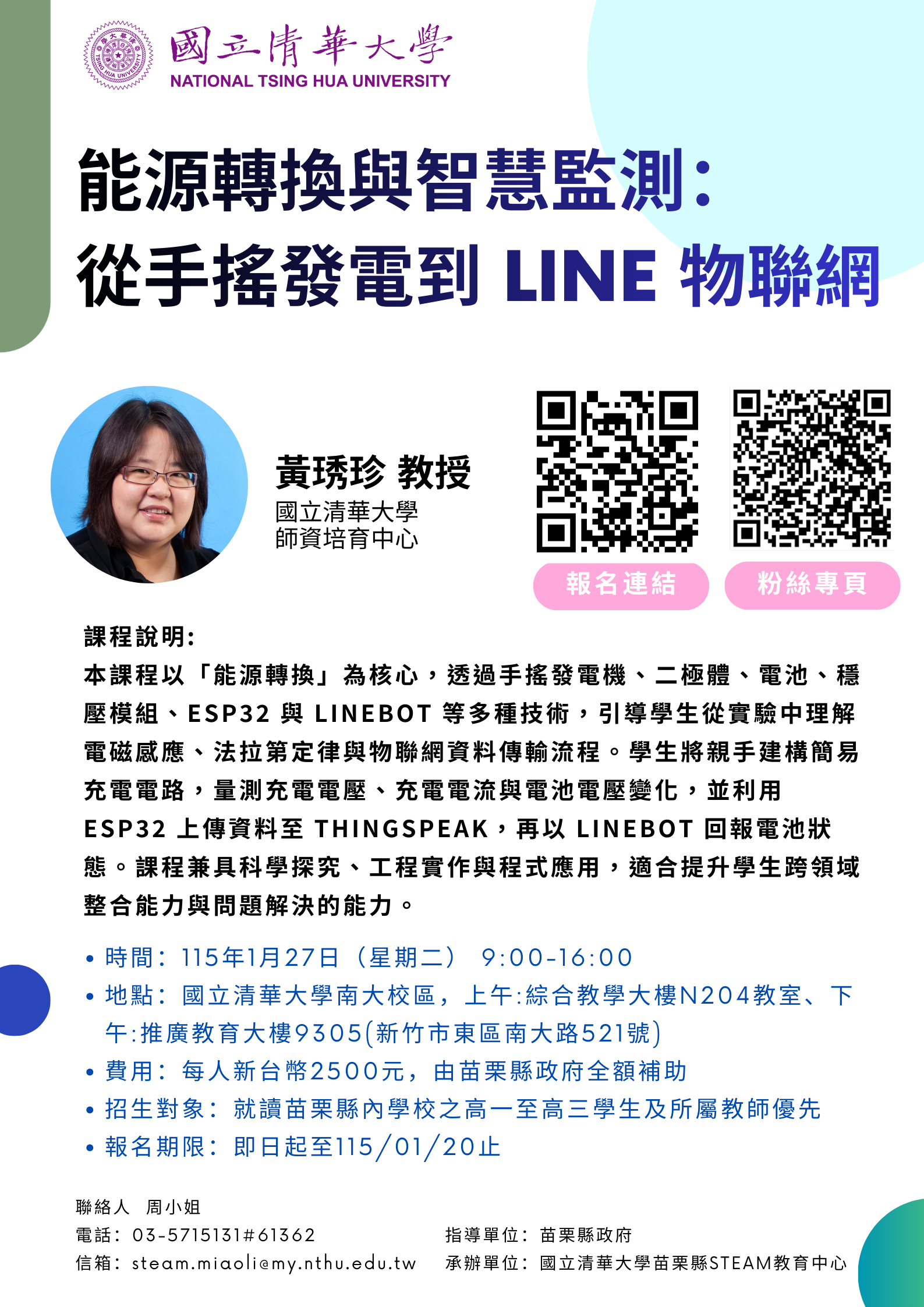 轉知-[國立清華大學]本校苗栗縣STEAM教育中心辦理「能源轉換與智慧監測:從手搖發電到Line物聯網」主題課程,敬請轉知並鼓勵所屬國小教師、國高中教師與學生踴躍參與