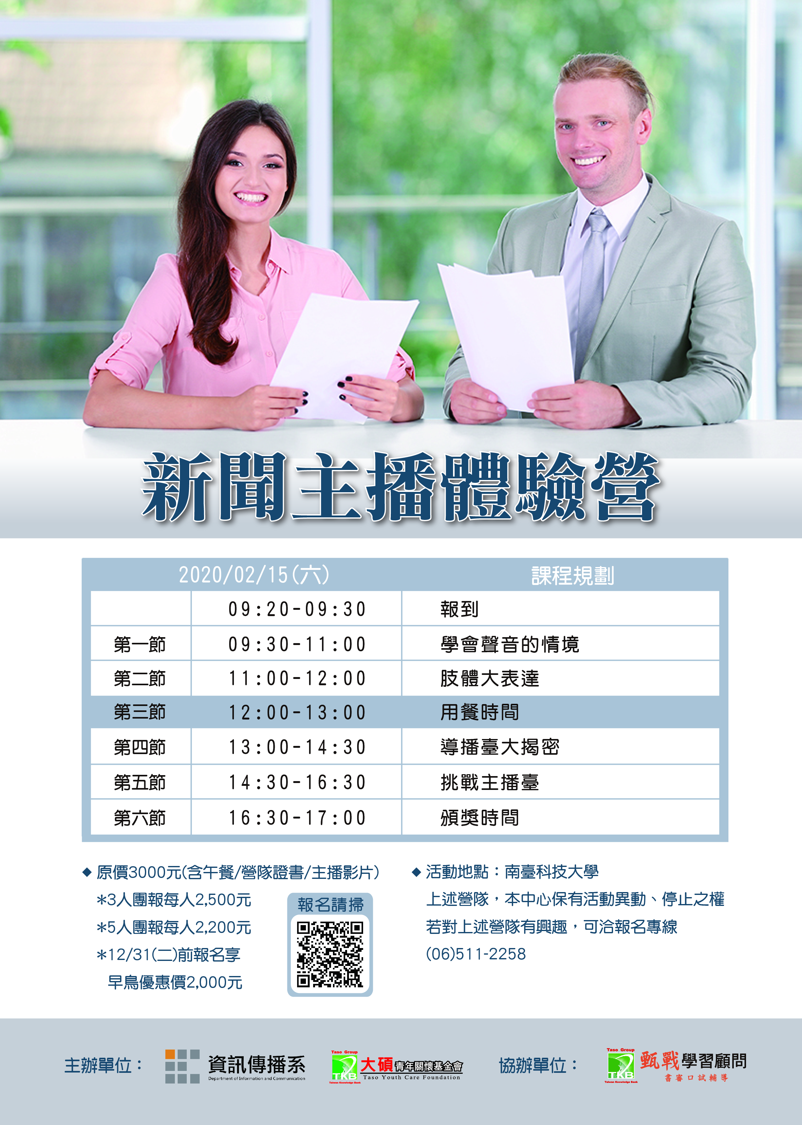 一、本校資訊傳播系將於109年與財團法人大碩青年關懷基金會合作舉辦《新聞主播體驗營》,希冀藉由營隊了解科系培養興趣及專業,也能對相關產業有更深層的認識與實際操作。此外,透過營隊互動、實作體驗等近距離接觸,讓同學對傳播領域有更進一步的了解與接觸。