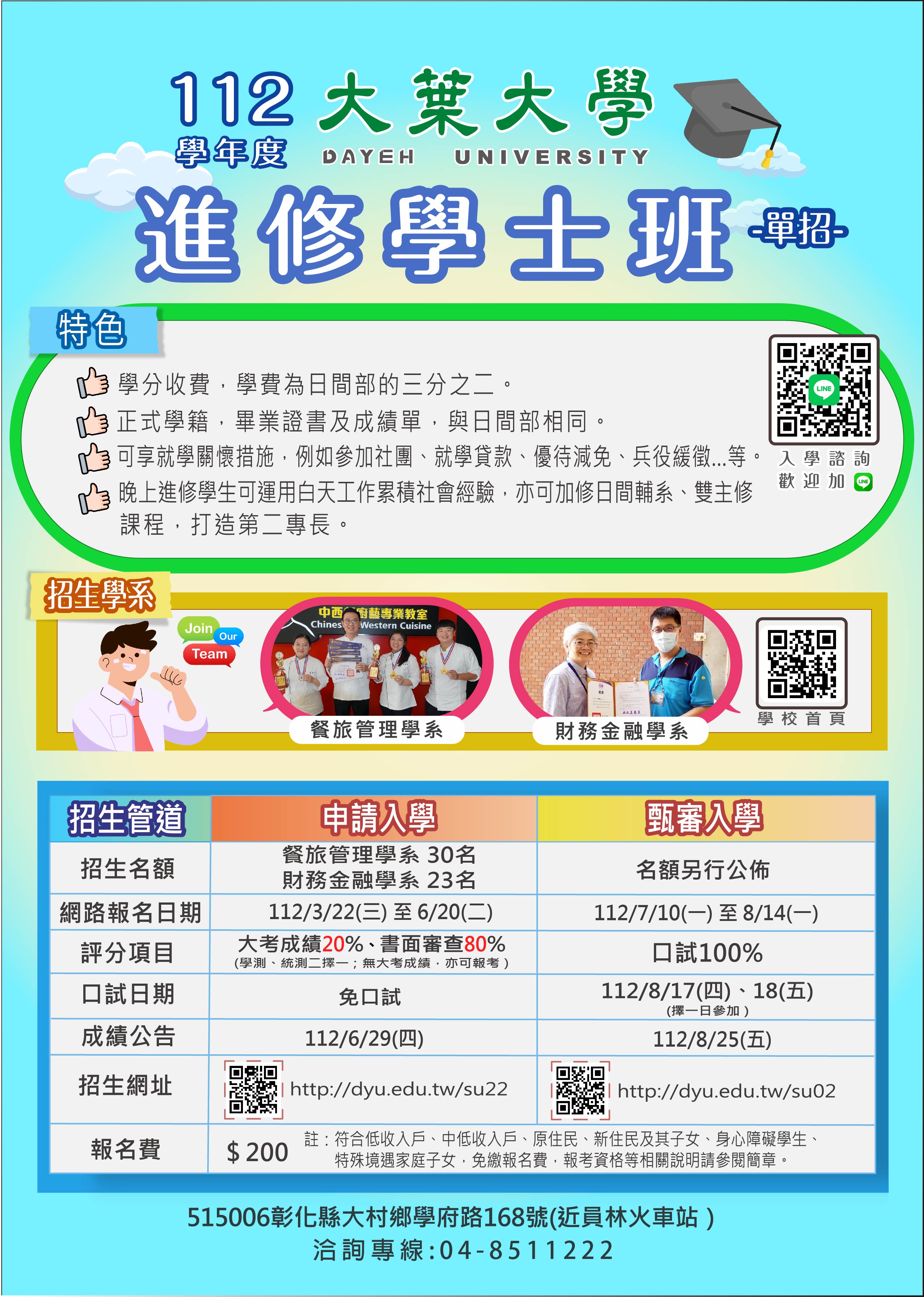 轉知 大葉大學112學年度進修學士班申請入學、身心障礙學生單獨招生資訊