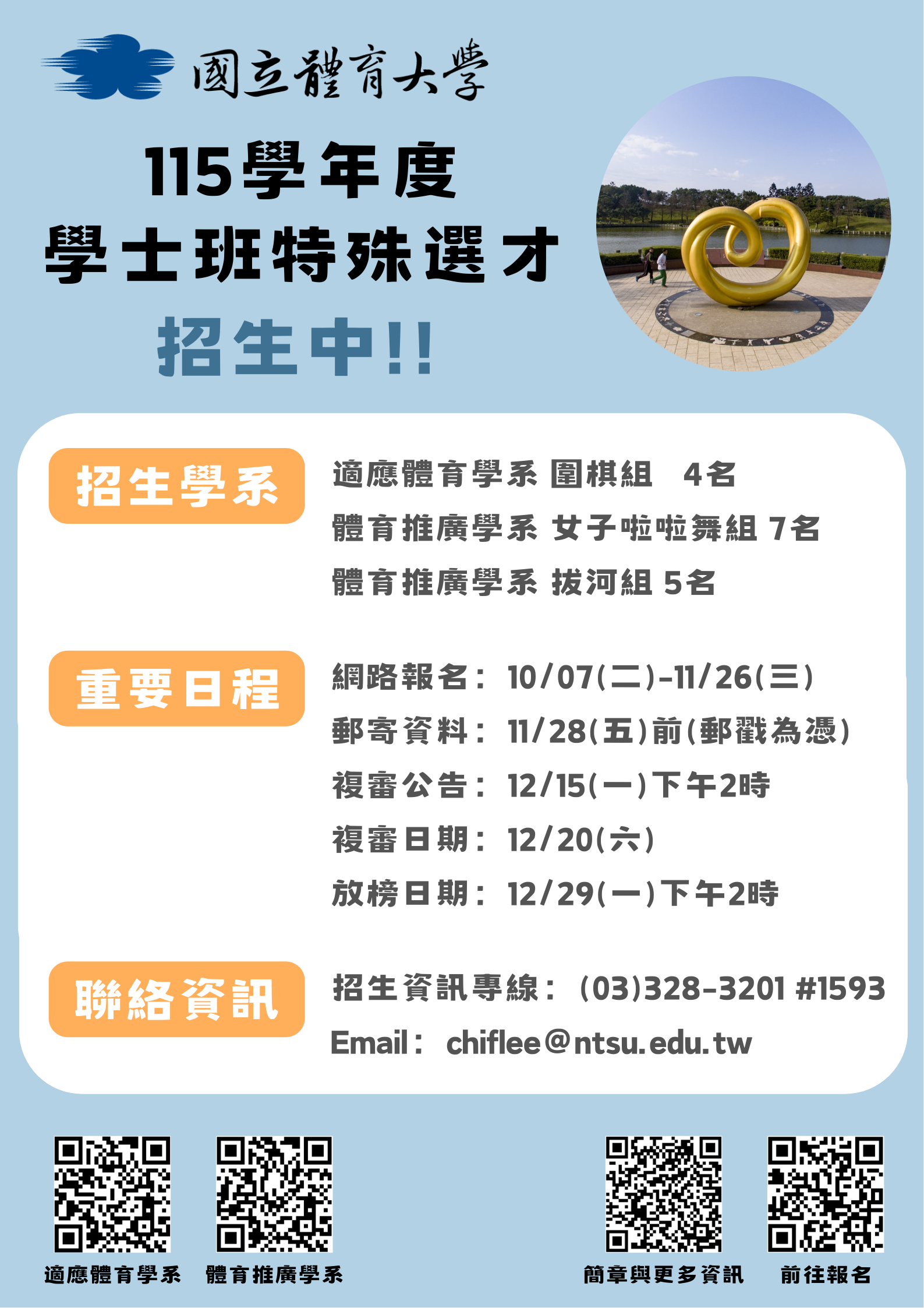 轉知 國立體育大學115學年度學士班特殊選才招生資訊