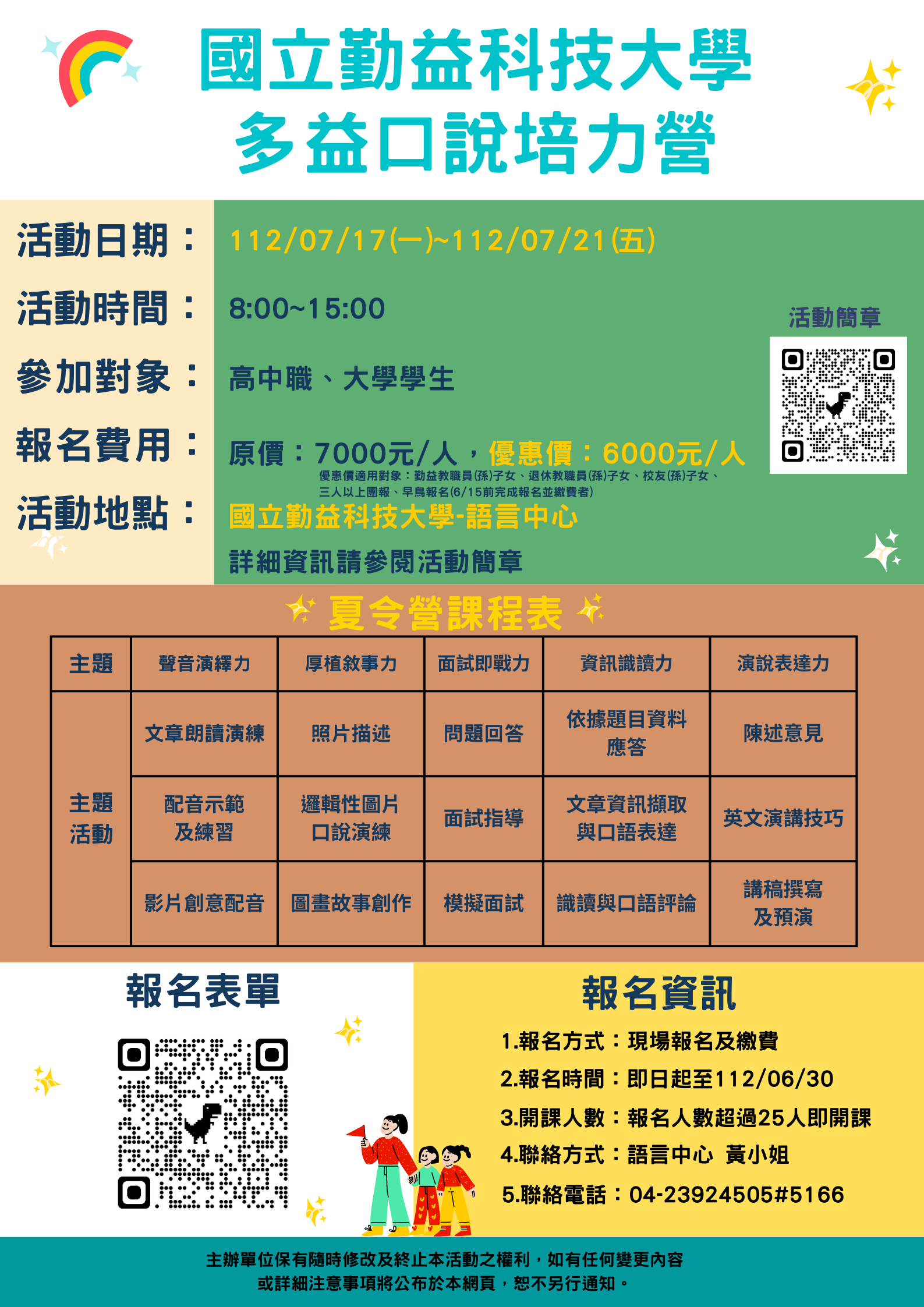 轉知 國立勤益科技大學辦理「2023年多元英文口語學習營」(7月10日至7月14日)及「2023年多益口說培力營」(7月17日至7月21日),招生簡章及宣傳DM電子檔