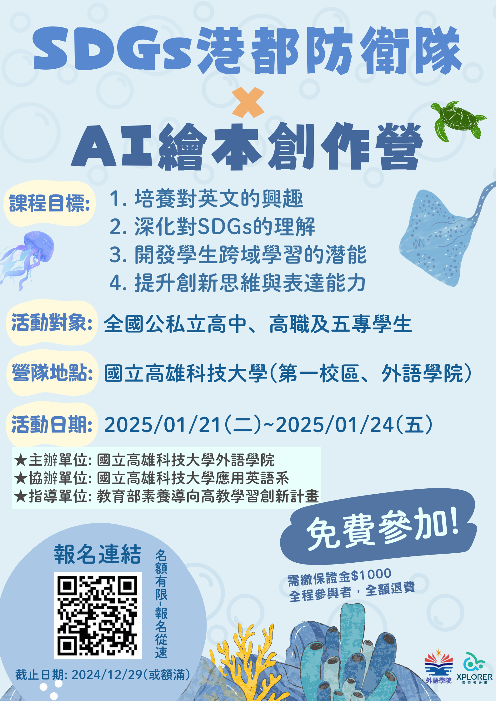 一、本校外語學院執行「教育部素養導向高教學習創新計畫」,預計於114年1月21日至114年1月24日舉辦「SDGs港都防衛隊 x AI繪本創作營」。本活動鼓勵全國公私立高中、高職及五專學生參與並深入探討海洋環境議題,並透過ChatGPT和AI繪圖生成文字及圖片,並應用於Canva 設計工具中,產出數位繪本,展現對海洋保育的認識與反思。本營隊採線上報名,額滿為止。