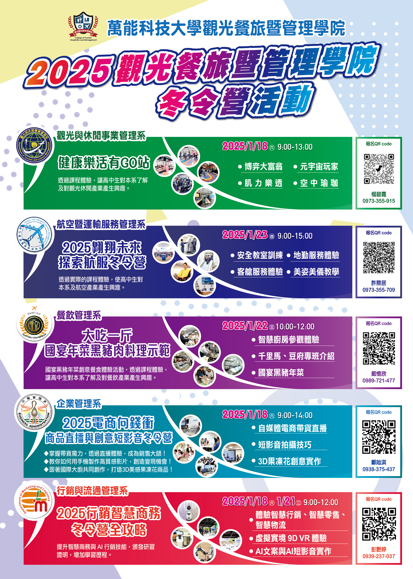 轉知 萬能學校財團法人萬能科技大學觀光餐旅暨管理學院各系舉辦2025冬令營活動文宣