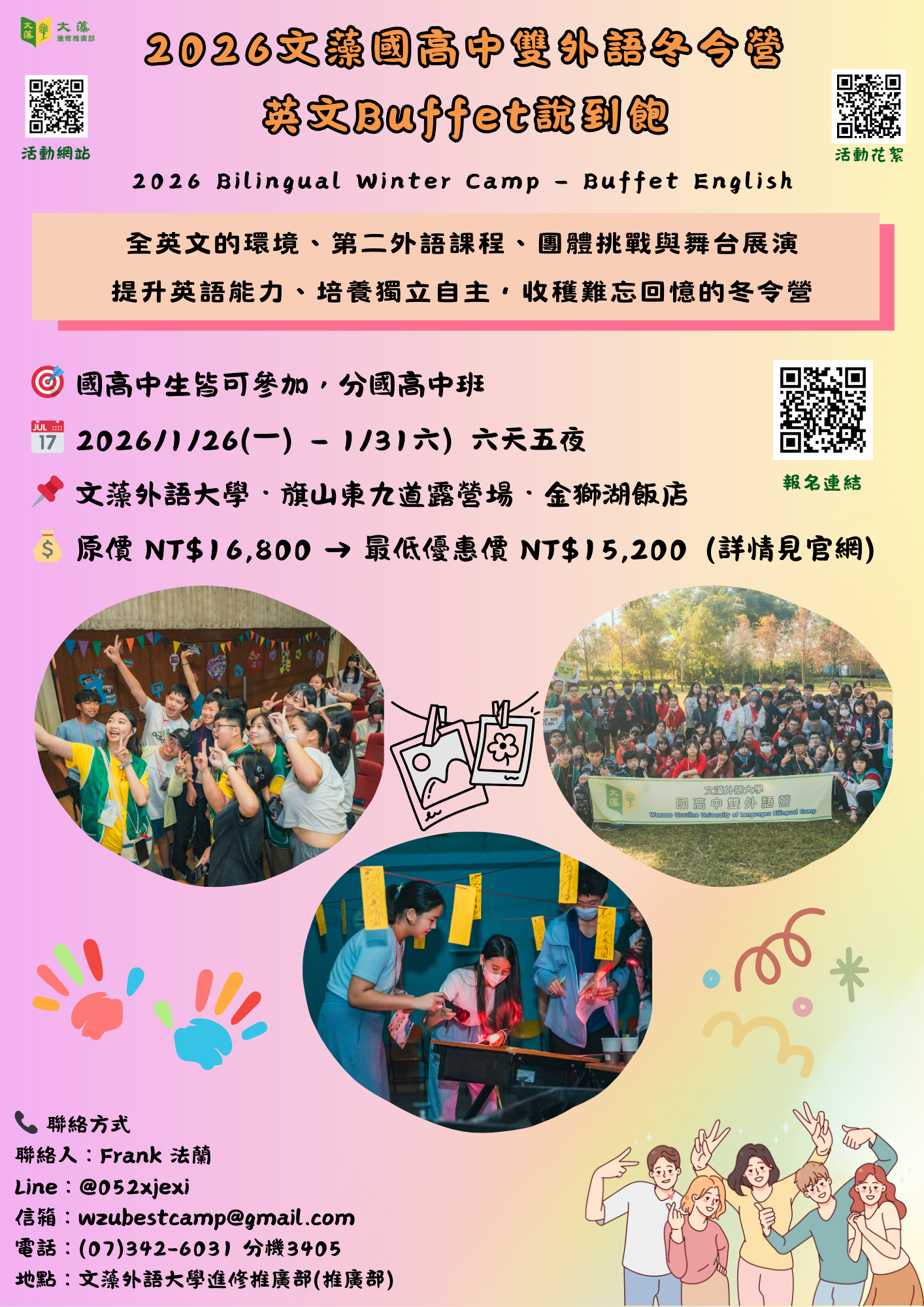 轉知 文藻學校財團法人文藻外語大學辦理2026文藻國高中雙外語冬令營海報