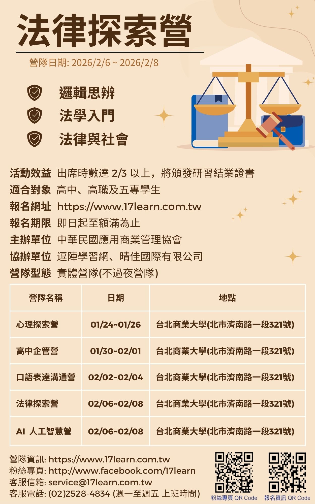 轉知 社團法人中華民國應用商業管理協會法律探索營-2026冬令營報名開始!!檢附活動簡章海報