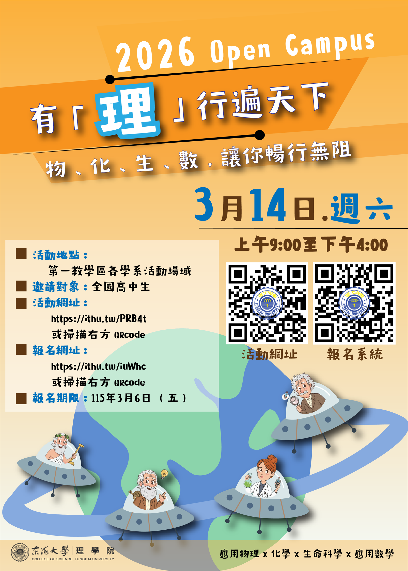 轉知 東海大學理學院辦理「2026年Open Campus 有『理』行遍天下,物.化.生.數.讓你暢行無阻」活動海報