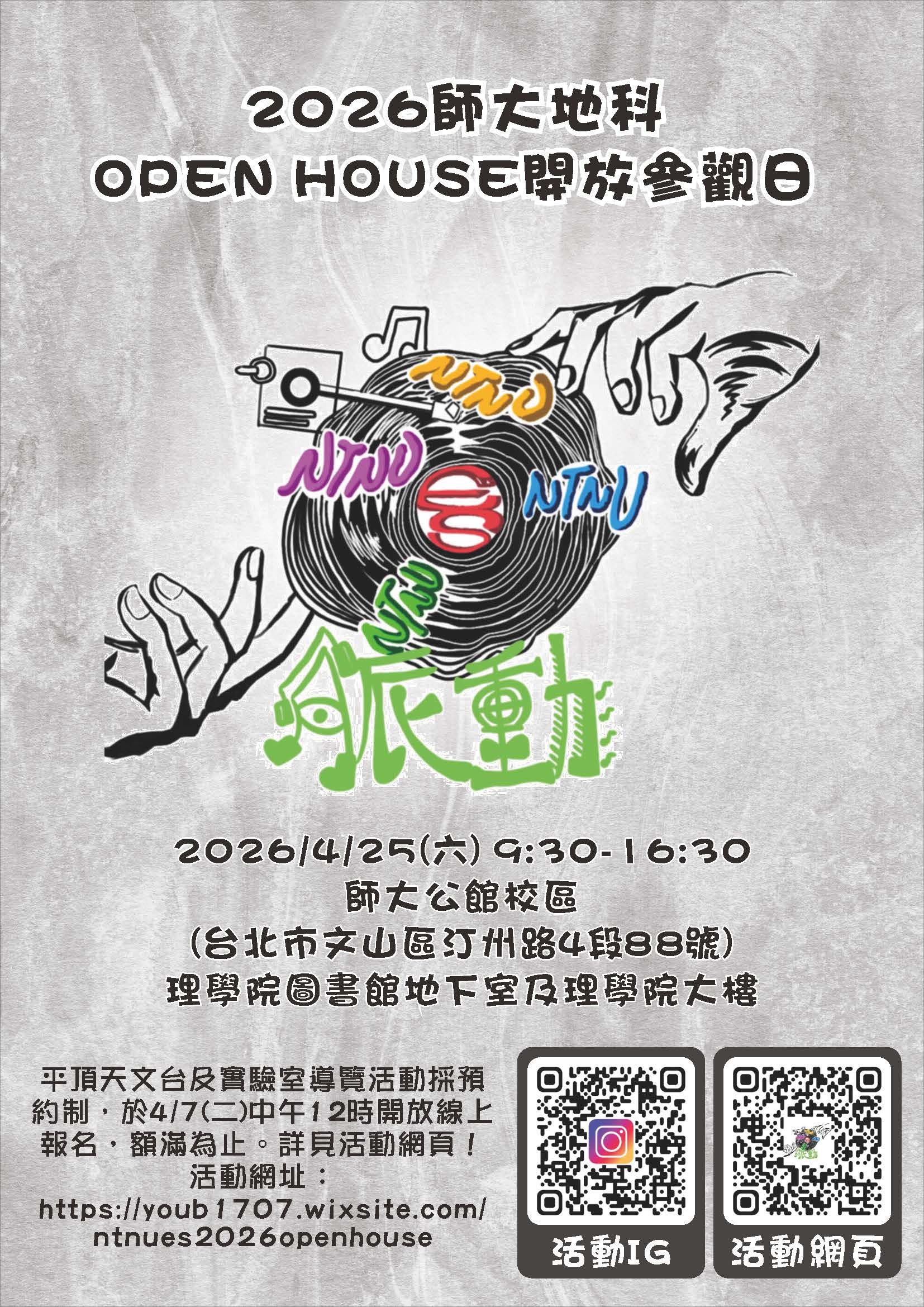 一、為推廣地球科學教育並引發學生對自然科學之學習興趣,本校地球科學系特辦理「2026師大地科開放參觀日」,結合互動體驗、實境解謎與研究展示,提供一場兼具知識性與趣味性的學習活動。