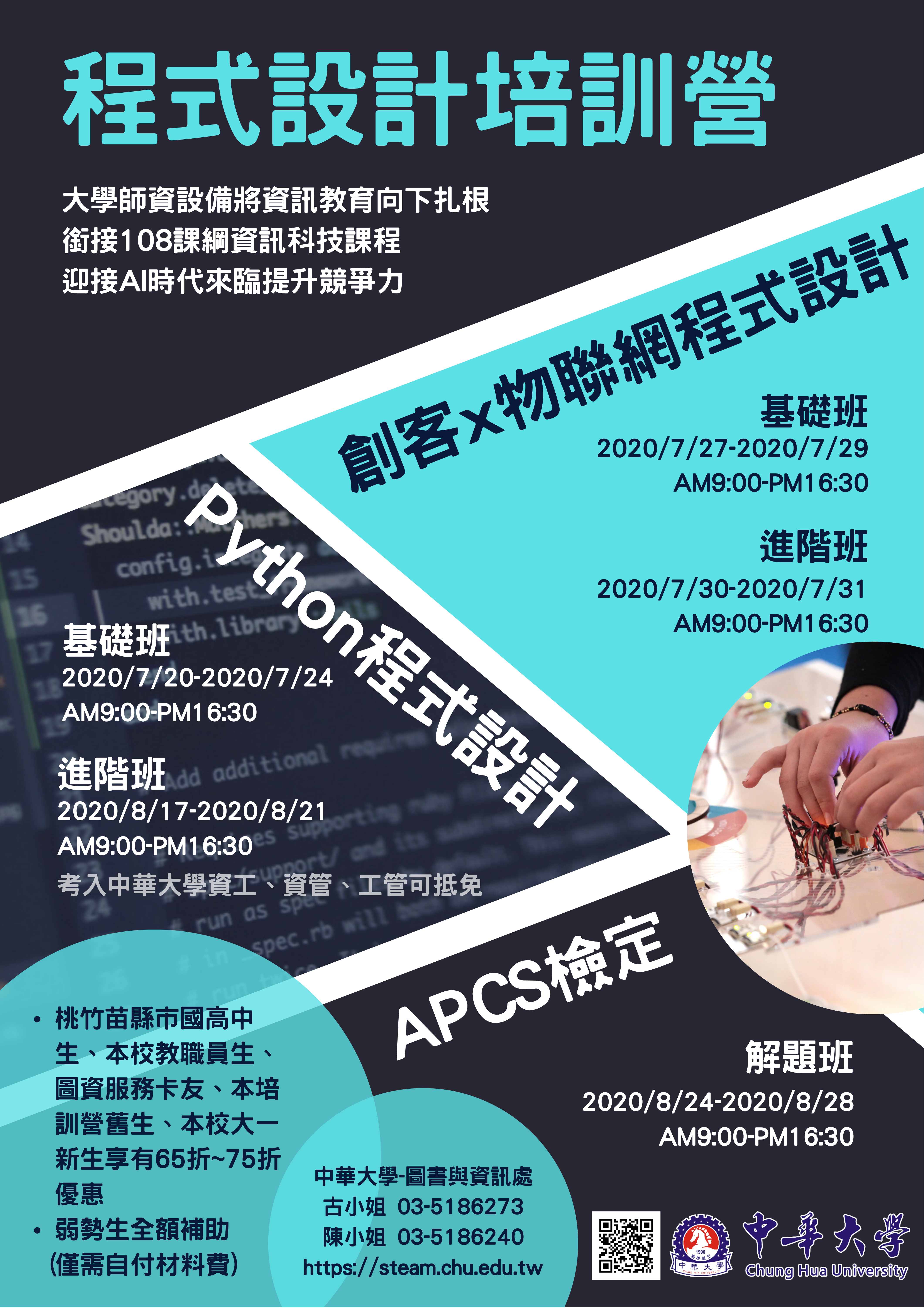 一、旨揭中華大學「程式設計培訓營」共五門課程,旨在讓國小高年級生、國中生與高中生可以順利銜接108課綱資訊科技領域必修的程式設計課程,培養學生運用程式設計解決問題的能力,有助於提升學生於數位時代之競爭力。