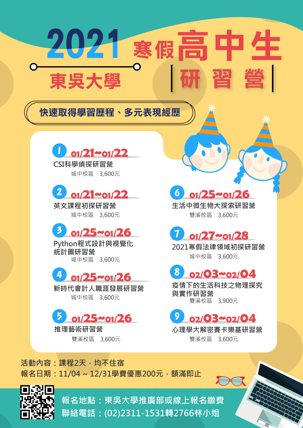 一、本次共計招生九個研習營:CSI科學偵探研習營、英文課程初探研習營、 Python程式設計與視覺化統計圖研習營、推理藝術研習營、新時代會計人職涯發展研習營、生活中微生物大探索研習營、2021寒假法律領域初探研習營、疫情下的生活科技之物理探究與實作研習營、心理學大解密賽卡樂基研習營。